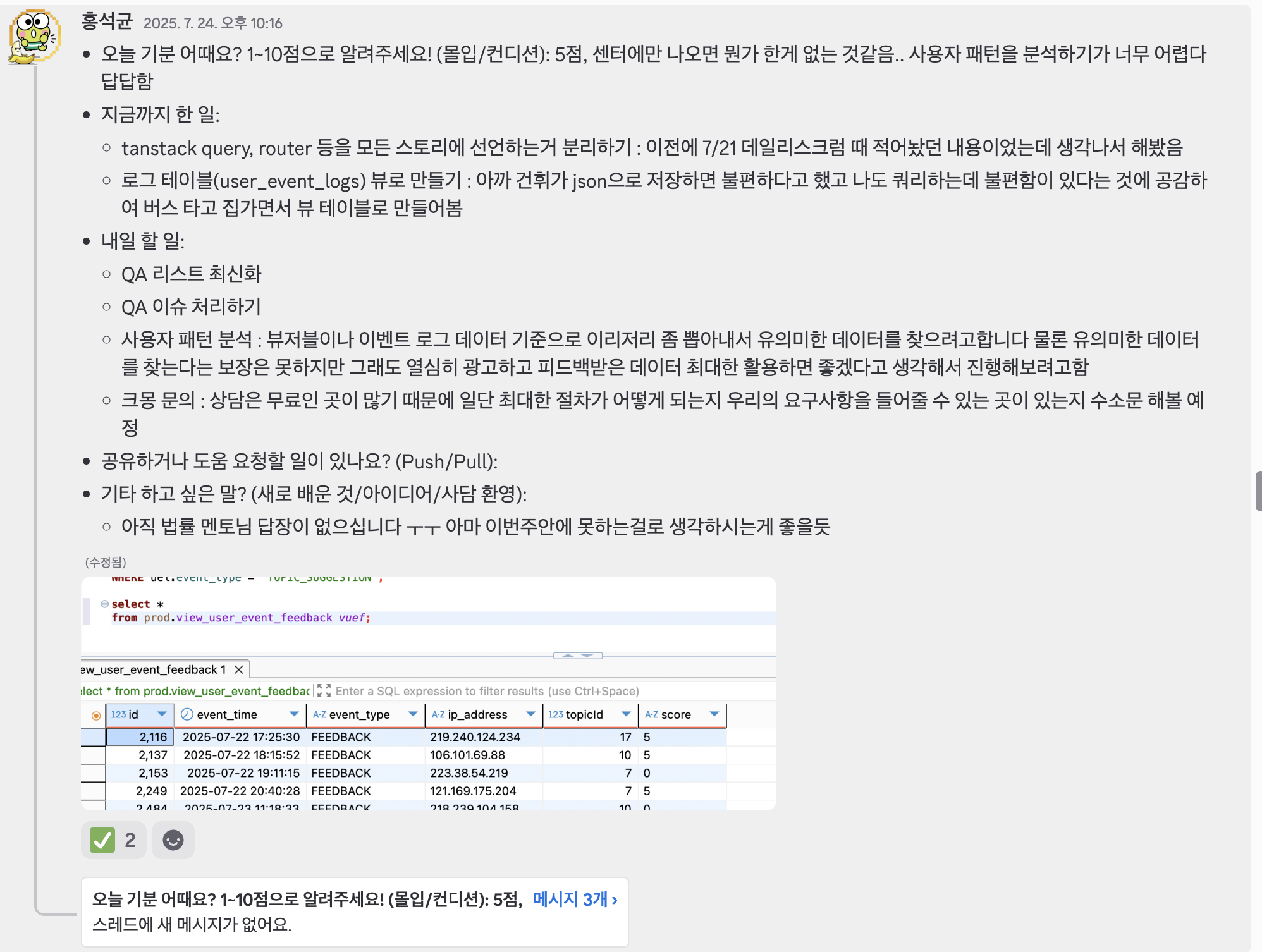 고맙게도 팀원이 영상을 보고 느낀 점을 공유해 주는 등의 좋은 반응을 얻을 수 있었다.