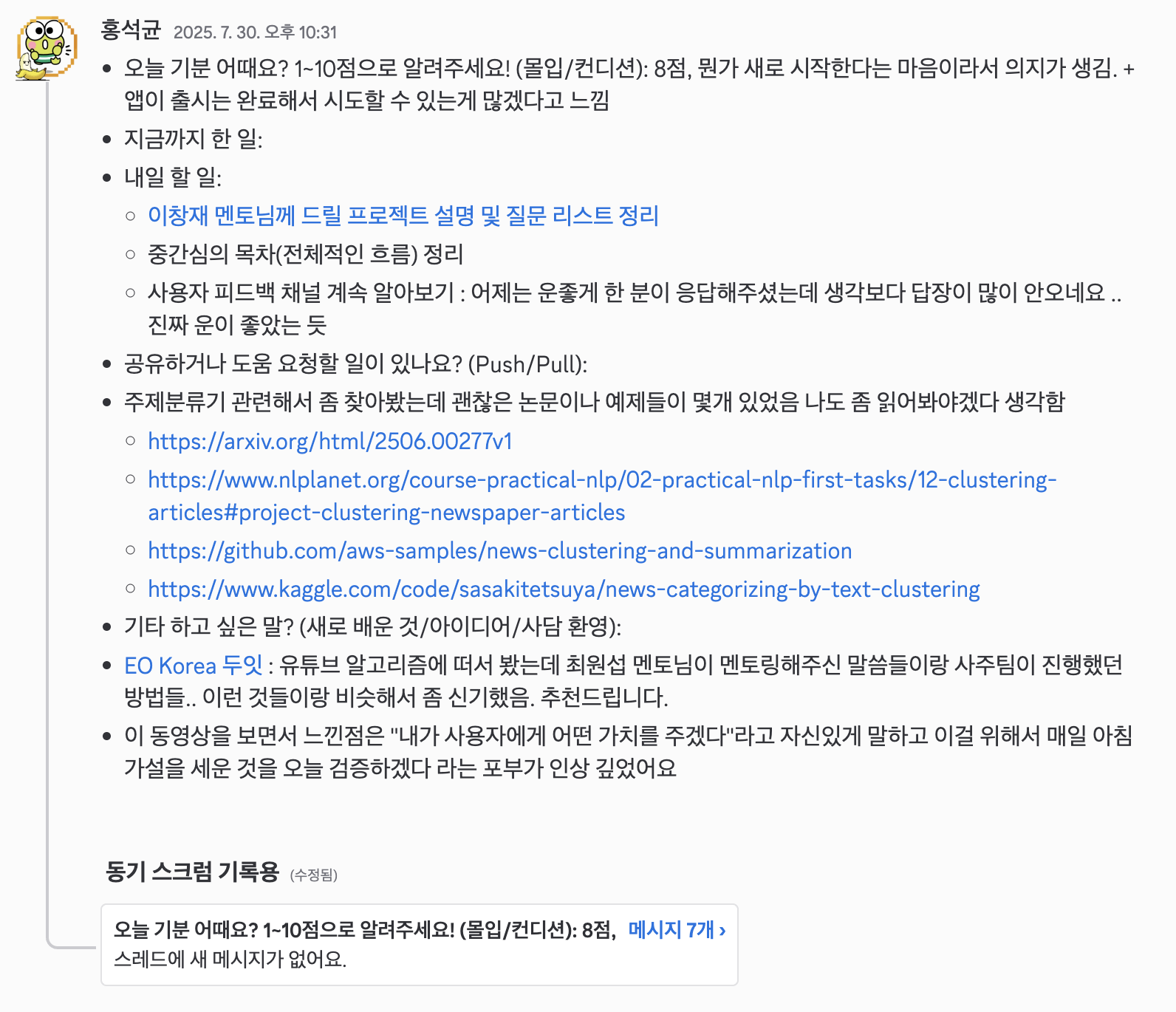 * 데일리스크럼 템플릿 - 기분 점수: 기분 점수는 프로젝트 몰입도나 개인적인 상황을 종합해서 1~10점 이내로 정한다. - 오늘 한일/내일 할일 : 진행사항과 어려운점 등을 적는다. - 공유하거나 도움 요청할 일이 있나요?: 일정을 리마인드하거나 내가 겪고 있는 어려움을 공유할 때 사용한다. - 기타 사항들: 새로 배운 것, 사담, 갑자기 떠오른 기획 아이디어 등을 공유할 때 사용한다.좋았던 순간