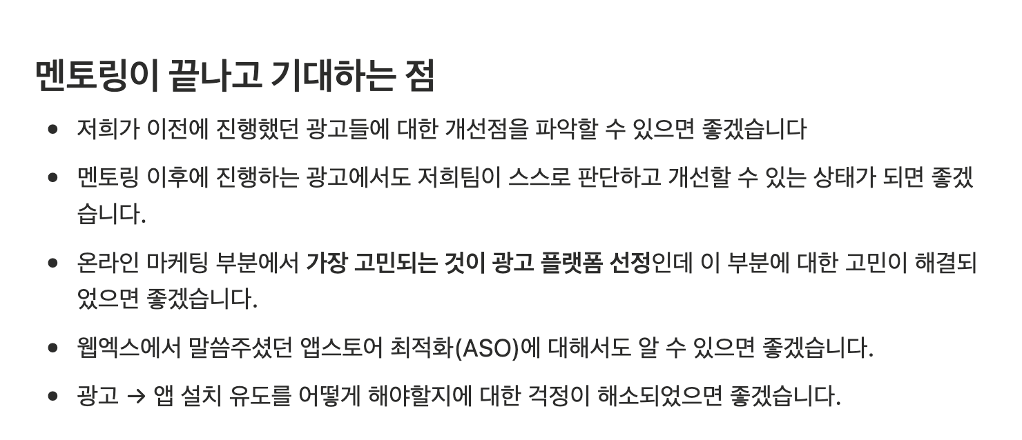 노션에 잘 정리해 주셔서, 저도 멘토링 준비를 많이 해올 수 있었어요."결과적으로 마케팅 멘토링을 통해 많은 인사이트를 얻을 수 있었고,